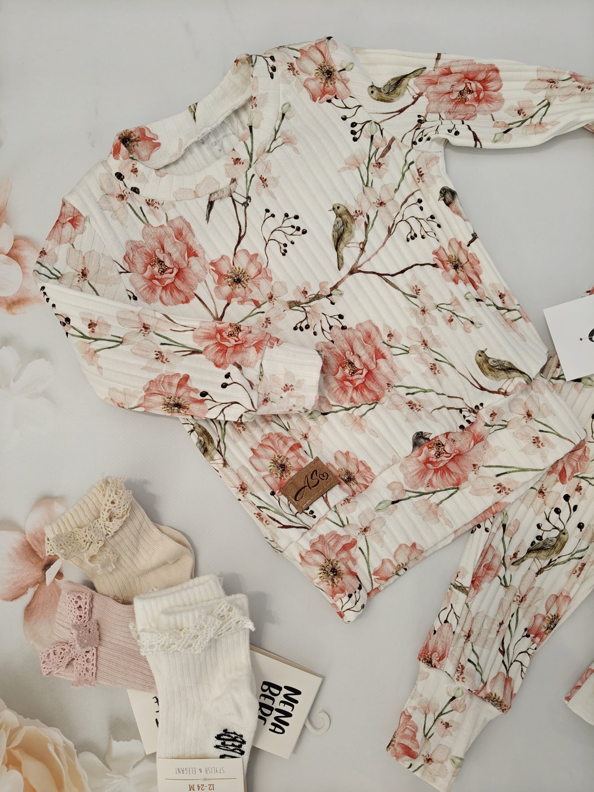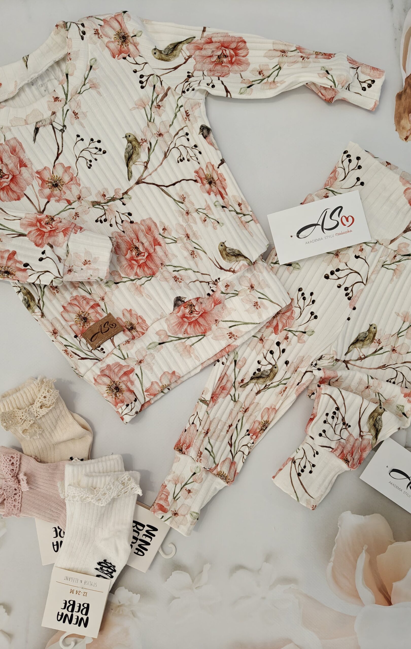 Dziewczęca bluzeczka z cudownym nadrukiem kwiatów i ptaszków z długim rękawem zakończonym mankiecikiem
