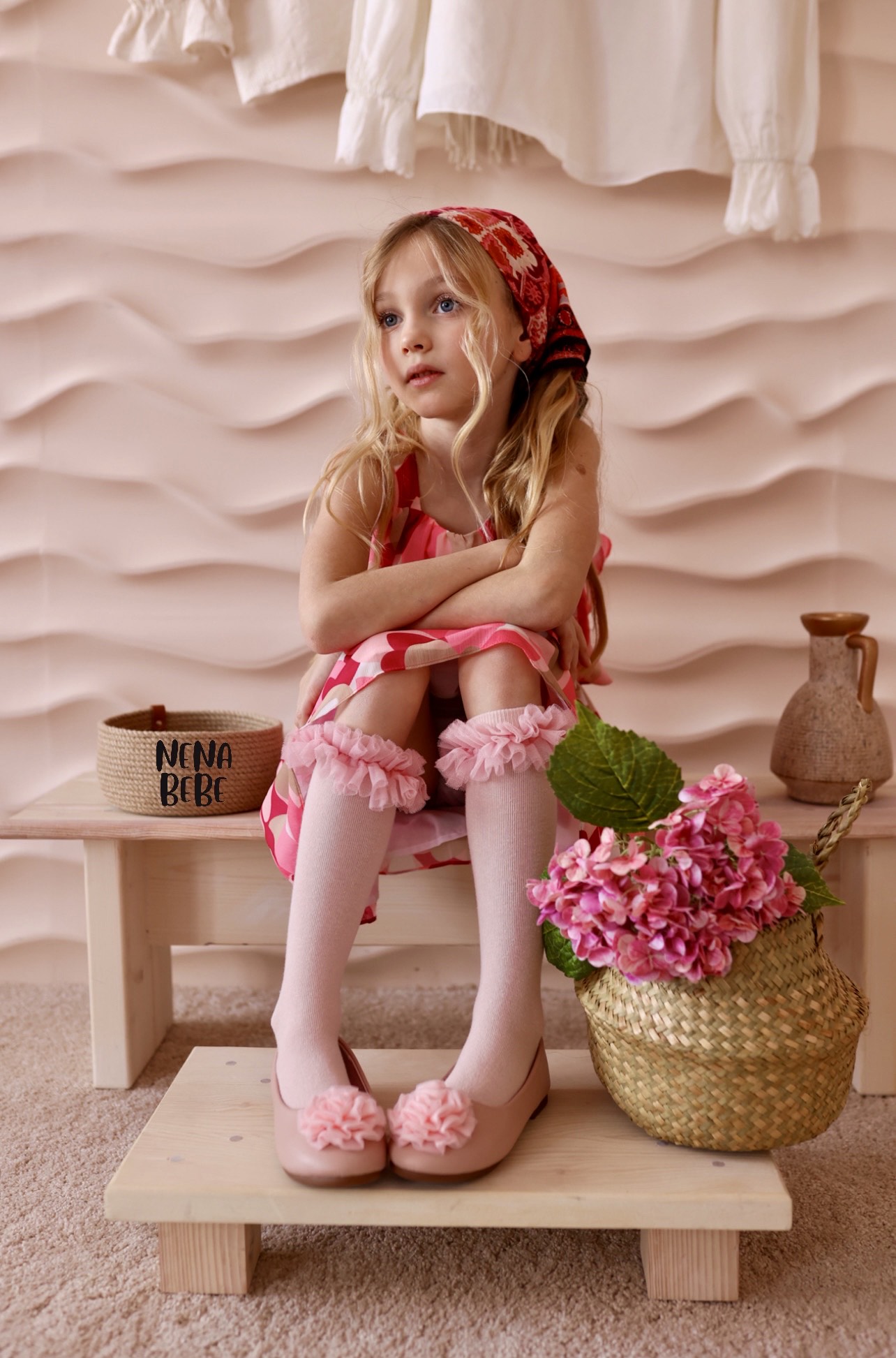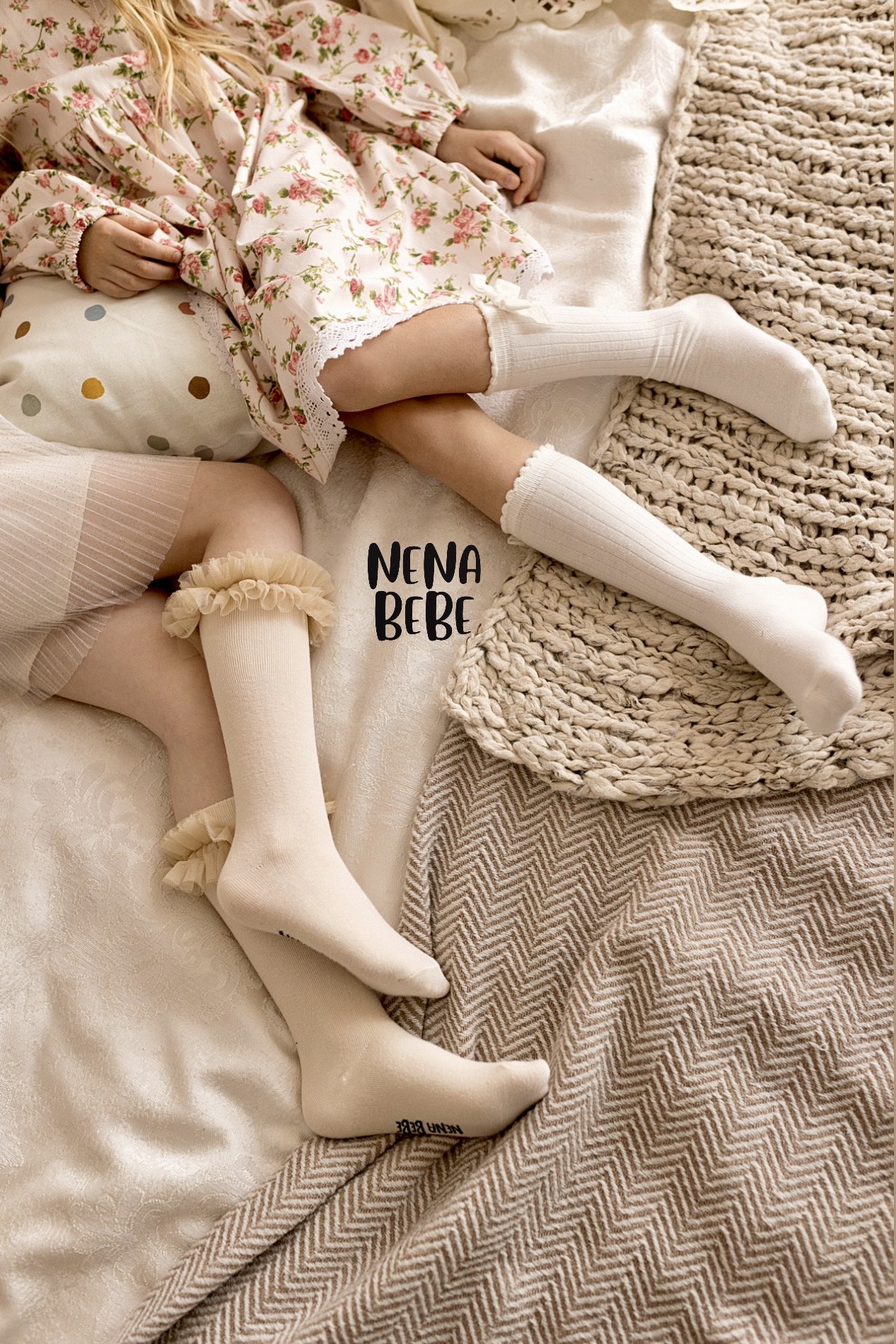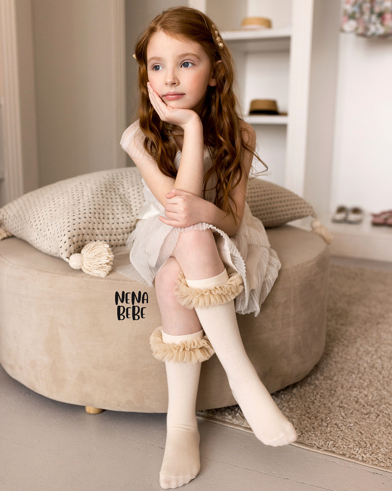 Podkolanówki gładkie z falbanką tiulową w sześciu pasujących do siebie kolorach.