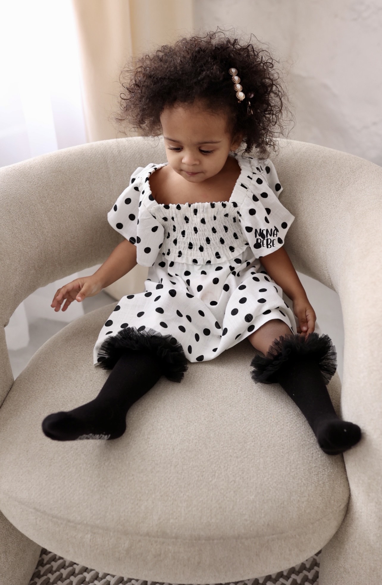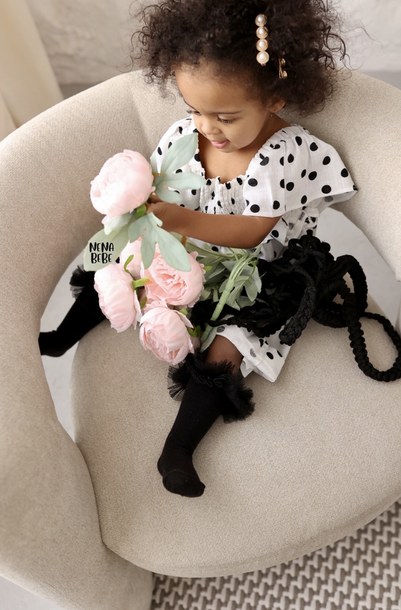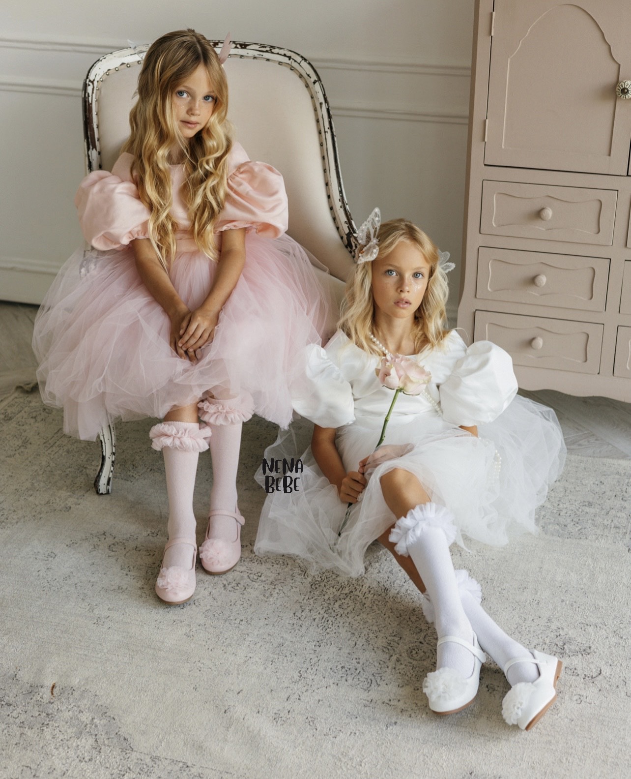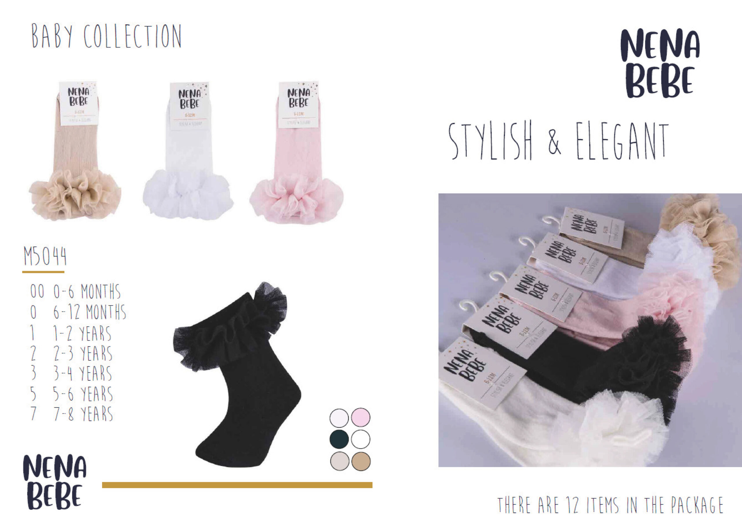 Podkolanówki gładkie z falbanką tiulową w sześciu pasujących do siebie kolorach.