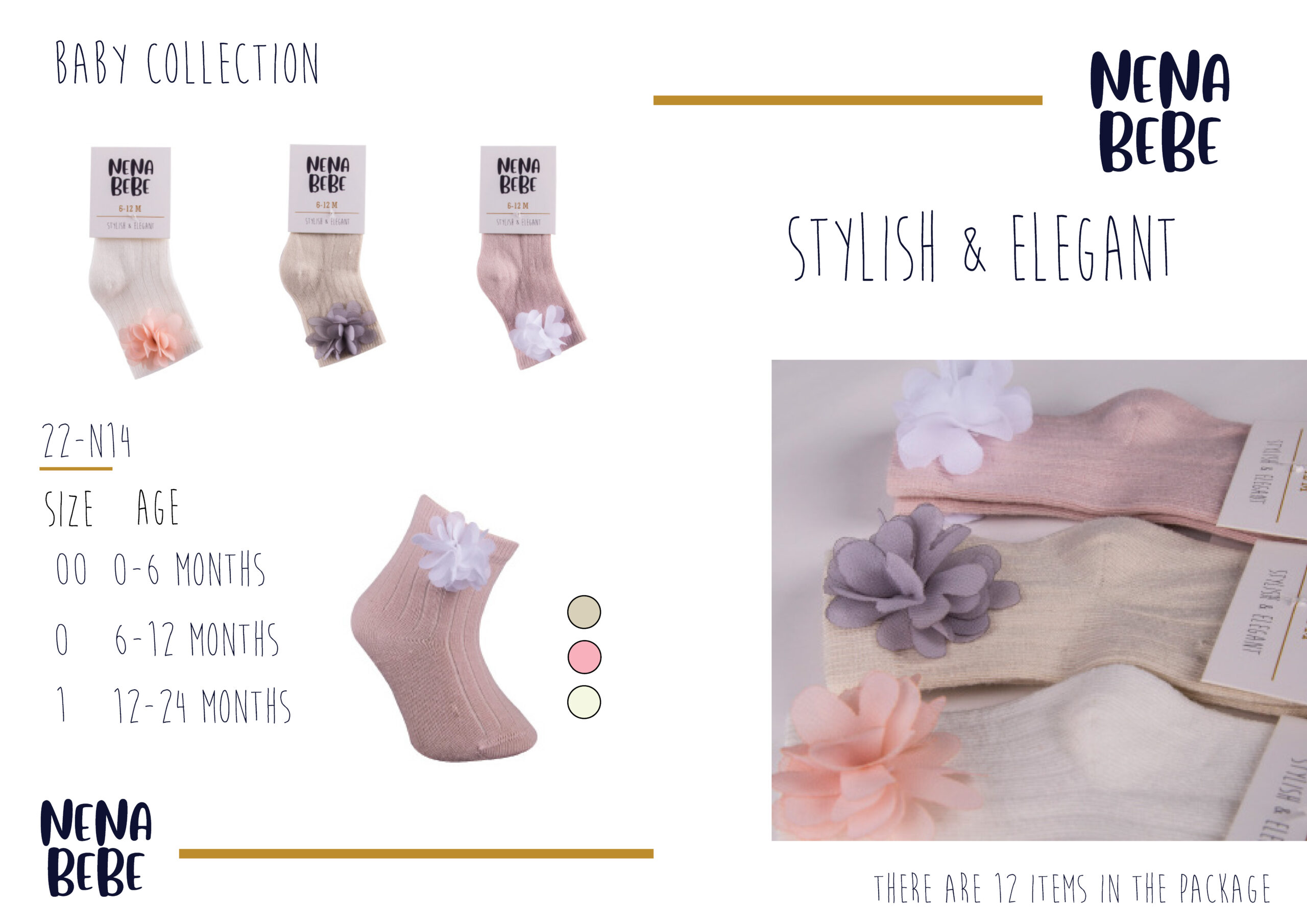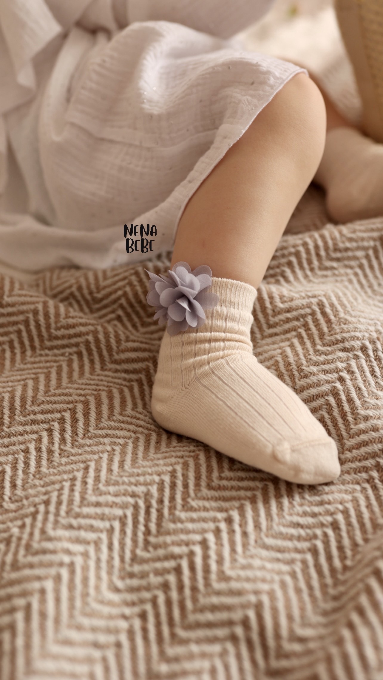 Skarpetki prążkowane dostępne w trzech jasnych kolorach zdobione idealnie dopasowanym kolorystycznie tekstylnym kwiatem.
