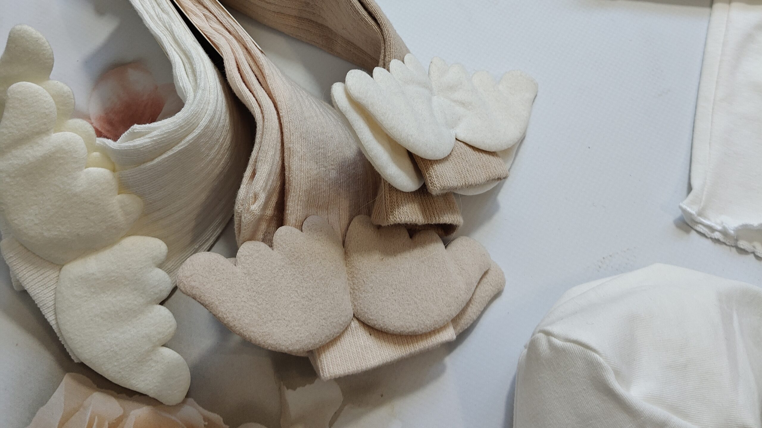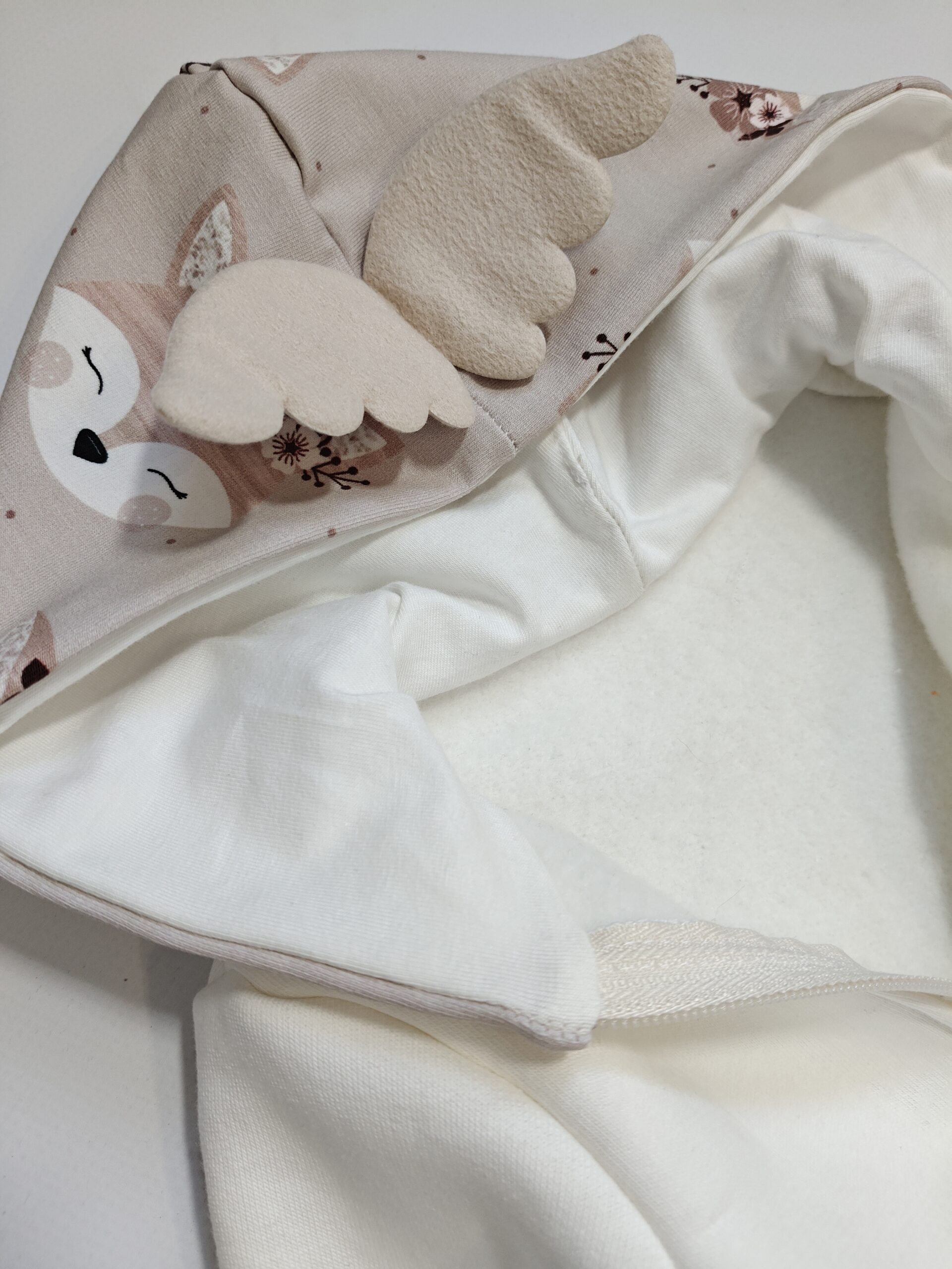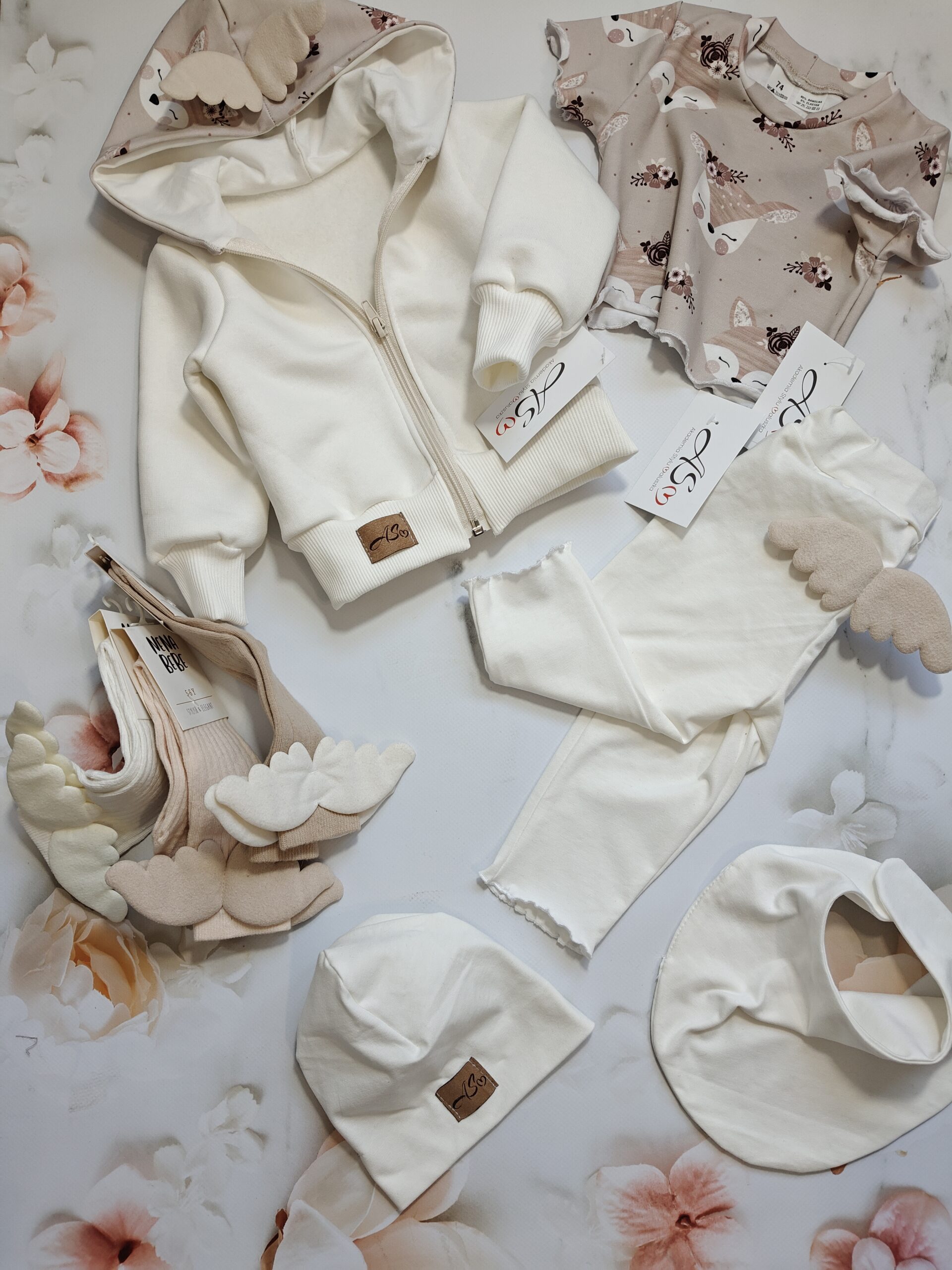 Cudowny i ponadczasowy zestaw dla młodej damy ceniącej sobie jakość i styl. Dresik wykonany jest z dzianiny dresowej – bluza , oraz dzianiny typu jersey – legi i t-shirt oraz czapka + chusta. Wszystko w odcieniach ecru oraz beżu z przepiękną grafiką oraz mięciutkimi skrzydełkami , które znajdziecie w tym samym kolorze na kolanówkach anioł .